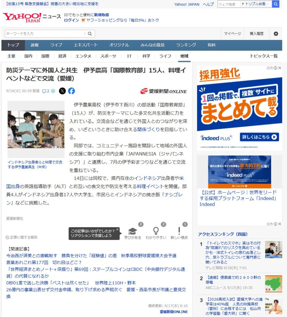 2025年9月14日に伊予農業高等学校と連携し行われた、防災をテーマにした多文化共生活動が、Yahoo!ニュースに掲載されました。